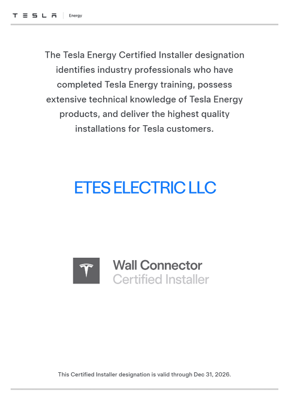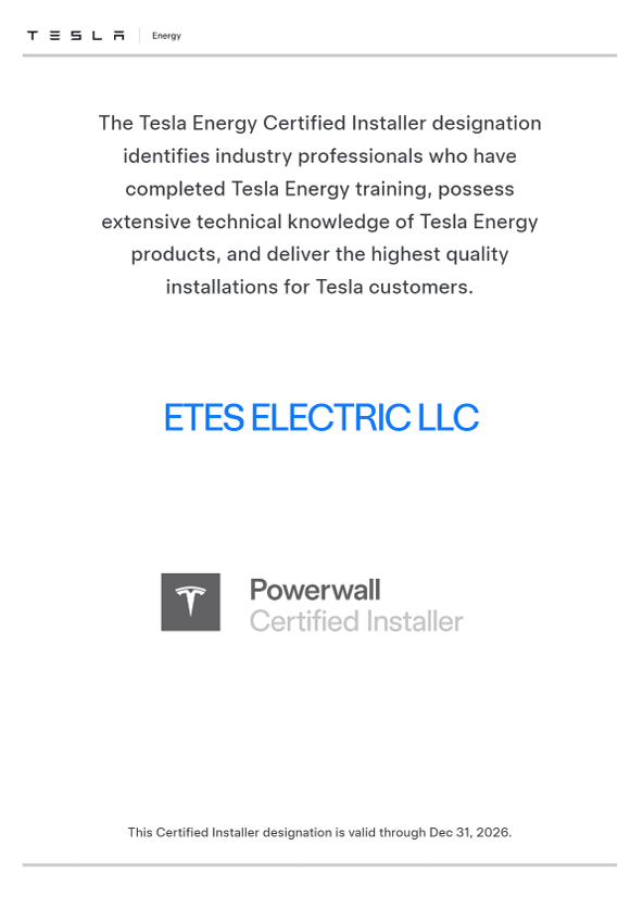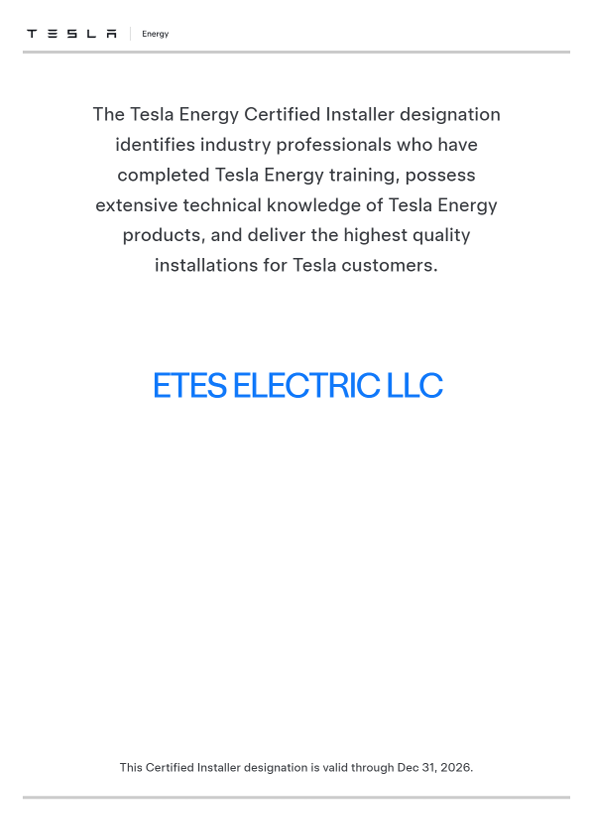 We are proud to announce that ETES Electric is now a Tesla Energy Certified Installer. This prestigious certification underscores our dedication to delivering top-tier energy solutions, backed by Tesla’s cutting-edge technology.